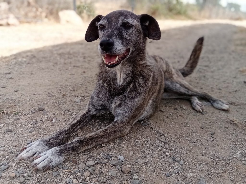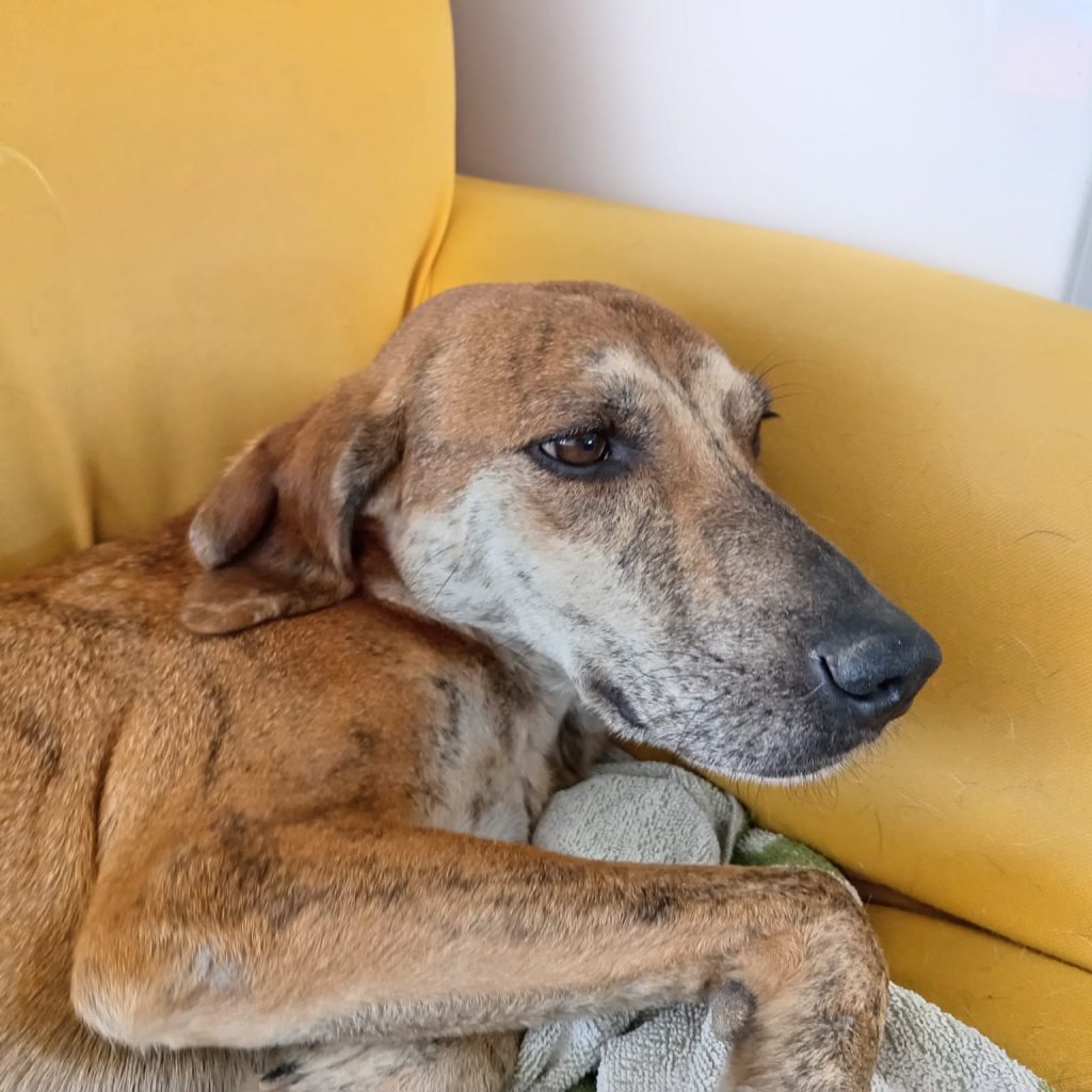 Lui è Cuma. È stato ritrovato denutrito e privo di forze sotto un albero di fico. Da varie testimonianze, sembra che Cuma vivesse li da molti giorni, proprio sotto i rami dell’albero. Si era creato un piccolo giaciglio di fortuna, e dalle tracce lasciate li accanto, si cibava dei pochi fichi maturi che cadevano al suolo. Lo abbiamo portato con noi al rifugio, ormai era privo di forze ma ora si è ripreso alla grande. Va d’accordo sia con maschi che con femmine. Ha un carattere pacifico, di indole tranquilla.