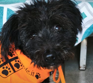 Arriva dal Comune di Riola, vicino ad Oristano. Non conosciamo la sua storia. E’ arrivata senza nome e quello attuale lo abbiamo scelto noi. E’ molto esuberante e non conosce la timidezza. Appena ci si avvicina a lei infatti ti salta in grembo non curandosi dei suoi chili di troppo. Si diverte portando “a spasso” le coperte che mettiamo nelle cucce. Va d’accordo con maschi e femmine